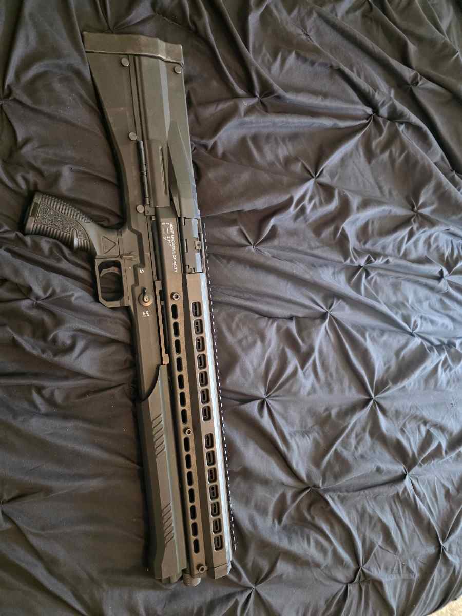 12-gauge bullpup pump-action shotgun with two 7-round magazine tubes, allowing for up to 15 rounds of capacity.